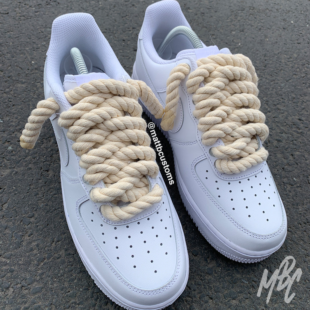Nike Air Force 1 featuring unique chunky rope laces which are cut short for style and comfortability. Rope laced Air Forces are the latest trend in footwear and are available now at No Sauce The Plug.. Rope Air Force 1 - Pure White. Sale price From £139.99. Rope Air Force 1 - CREAM 2.0. Sale price From £159.99. Rope Air Force 1 - Lover Boy.
