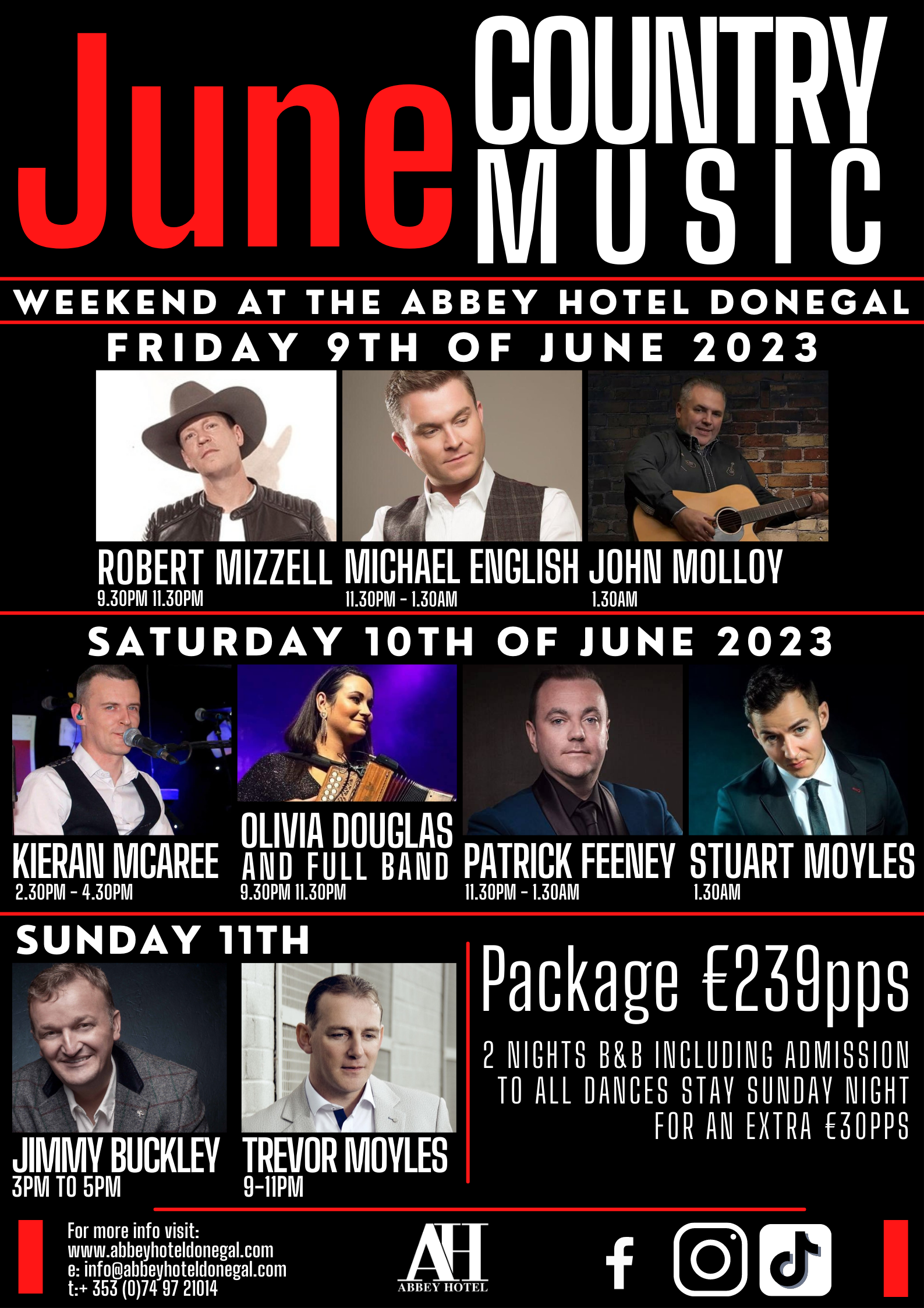 Dates: June 9th-11th, 2023. Get ready for an incredible weekend filled with toe-tapping tunes and country music magic! Join us at The Abbey Hotel in Donegal for a lineup that will have you dancing the night away. Friday, June 9th, 2023. Robert Mizzell - 9:30 PM.
