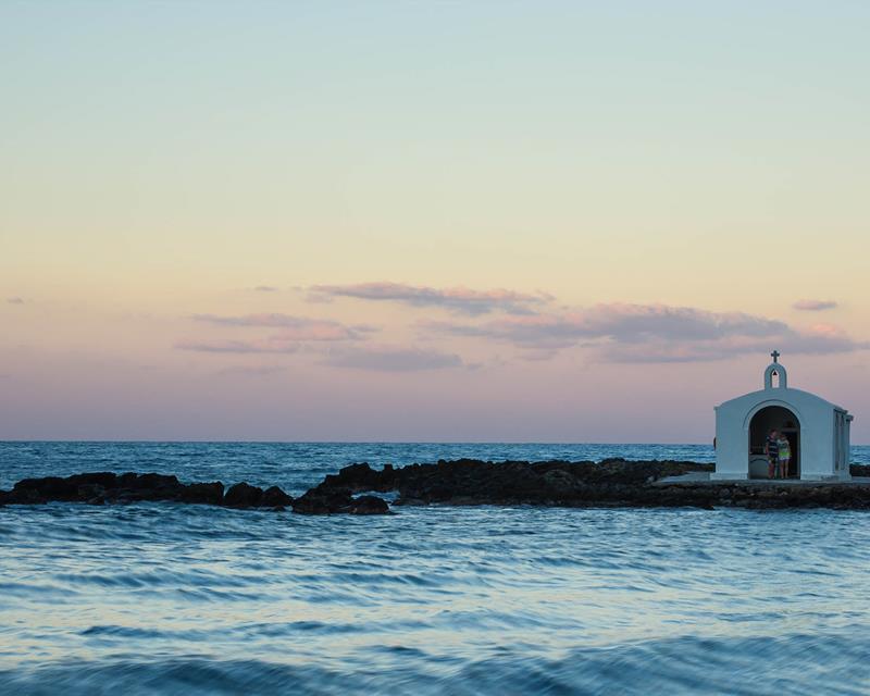 The church from far looks like floating on the sea surface. The area of Georgioupolis is inhabited at least since the Minoan times. A Minoan tomb has been found on the hill Kastelos. Georgioupolis is located in the site of ancient Amfimalla, which was the port city of Lappa (currently Argiroupoli). Indeed, several devotional findings have been.